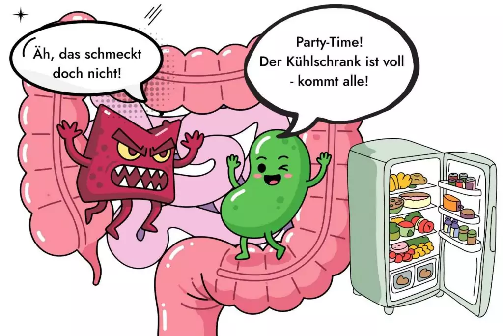 Schlechte Bakterienstämme sind bei Zuckerentzug in der Lage, aus Kohlenhydraten und Ballaststoffen energiereiche Verbindungen zu bilden, die den Blutzuckerspiegel und damit auch das Hungergefühl beeinflussen können. Gleichzeitig senden sie Signale an dein Gehirn, die dein Verlangen nach Süßem weiter anheizen.
