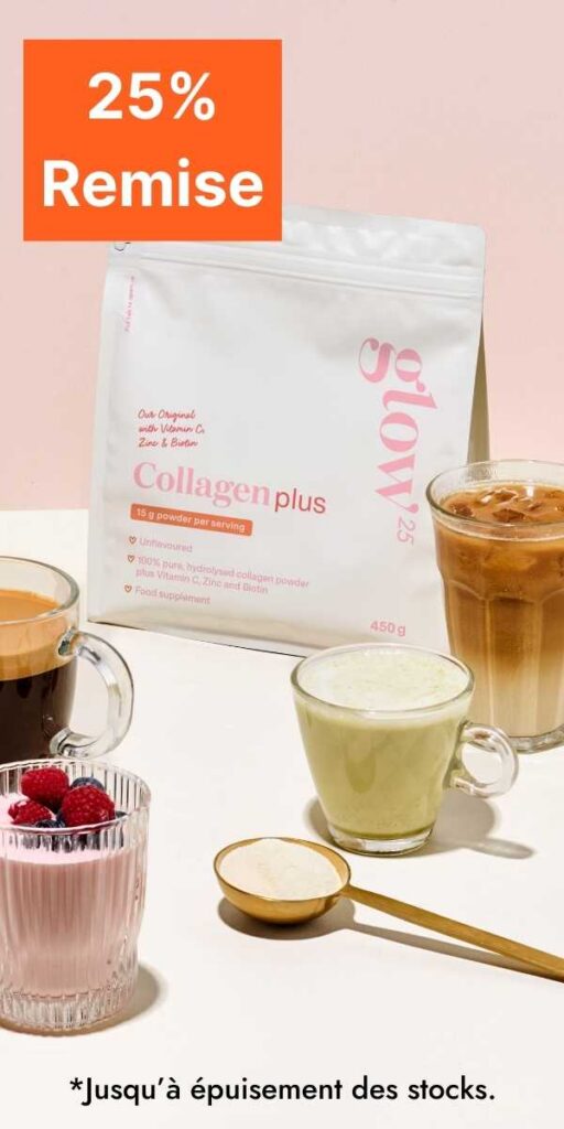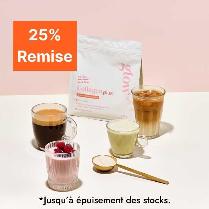 Étant donné que nous recevons actuellement de nombreuses demandes concernant le collagène, nous avons négocié une offre spéciale pour nos lectrices avec le gagnant du test, Glow25. Nous voulions que vous puissiez essayer le collagène sans prendre de risque.