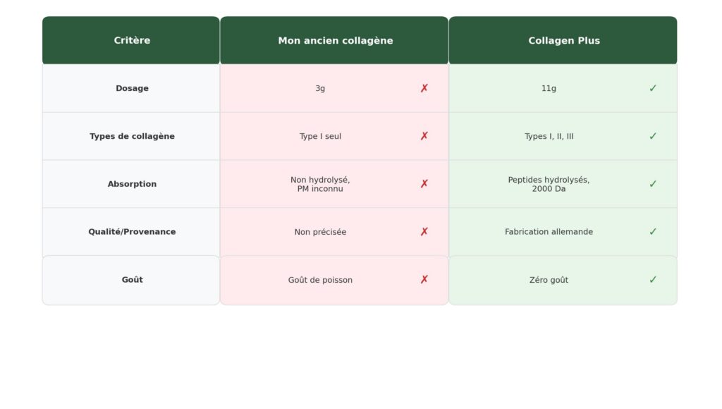 Les 5 critères : mon ancien collagène vs Collagen Plus