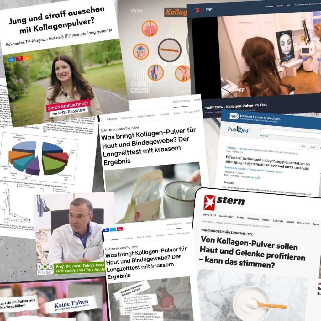 Des tests télévisés de longue durée (par exemple Le Mag de la santé) ont également montré que le collagène peut être particulièrement utile pour atténuer les rides du visage, réduire la cellulite et soulager les problèmes articulaires.