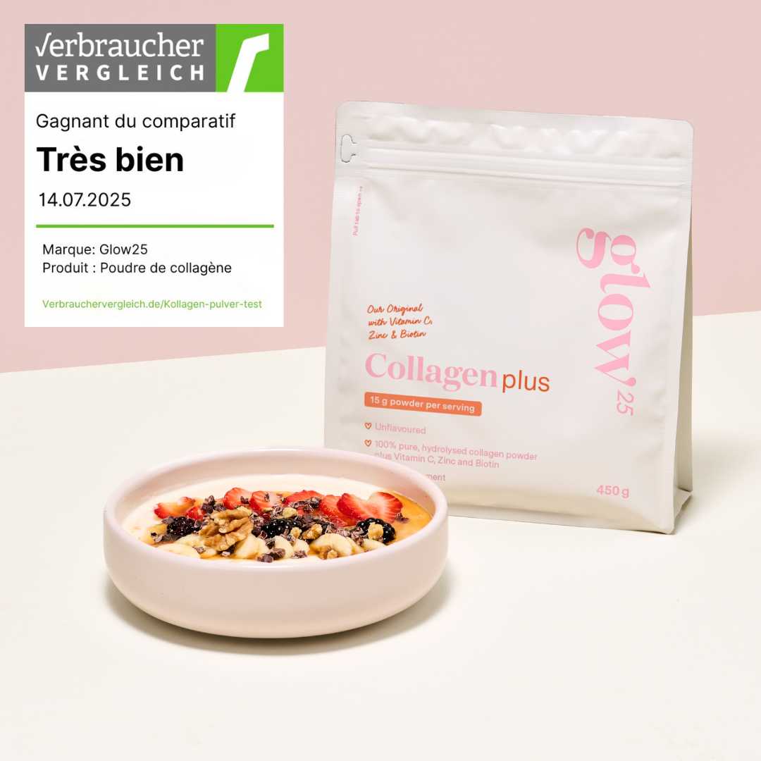 La poudre de collagène est censée pouvoir lisser les rides et le relâchement cutané en 6 à 10 semaines. Des reportages télévisés et des études récentes montrent en effet que c’est exactement ce qui se passe. Souvent utilisée dans ce contexte : La célèbre marque Glow25, mais cela fonctionne-t-il vraiment au quotidien ? Nous avons testé la marque berlinoise et vous expliquons pourquoi vous ne devriez acheter la poudre qu’à une condition bien précise !