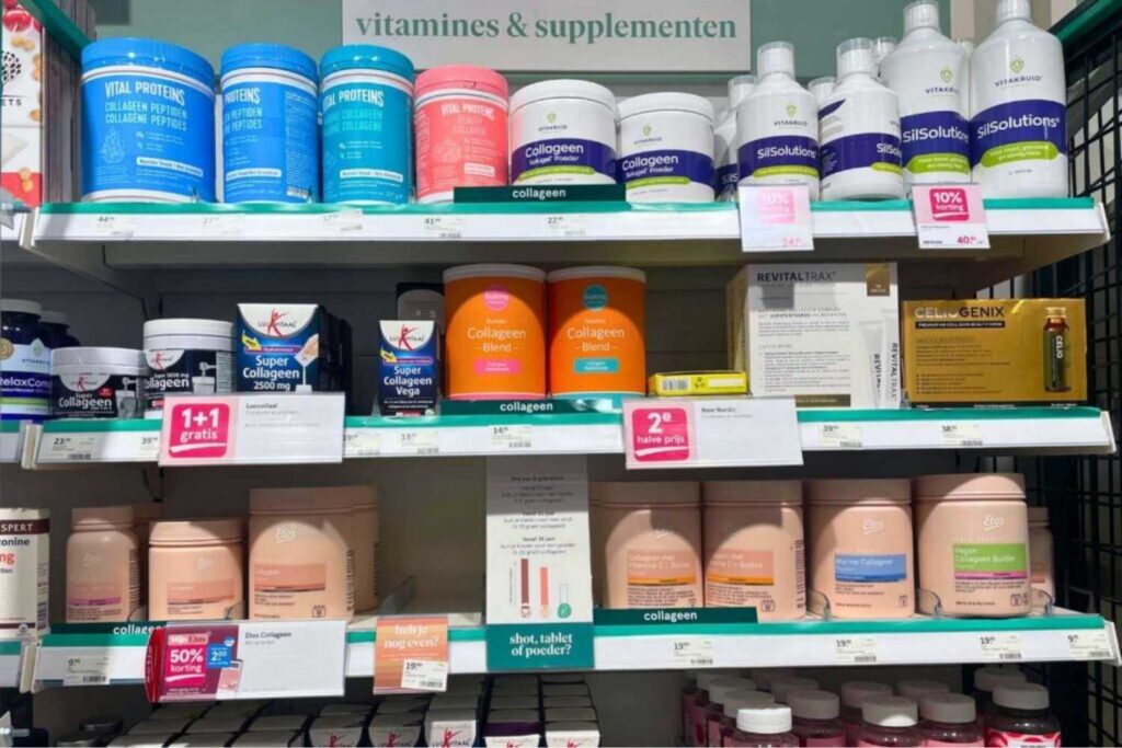 Wie een drogisterij binnenloopt, ziet tientallen potjes met grote beloften. “Ondersteunt gewrichten”, “houdt kraakbeen soepel”, “met collageenpeptiden”.