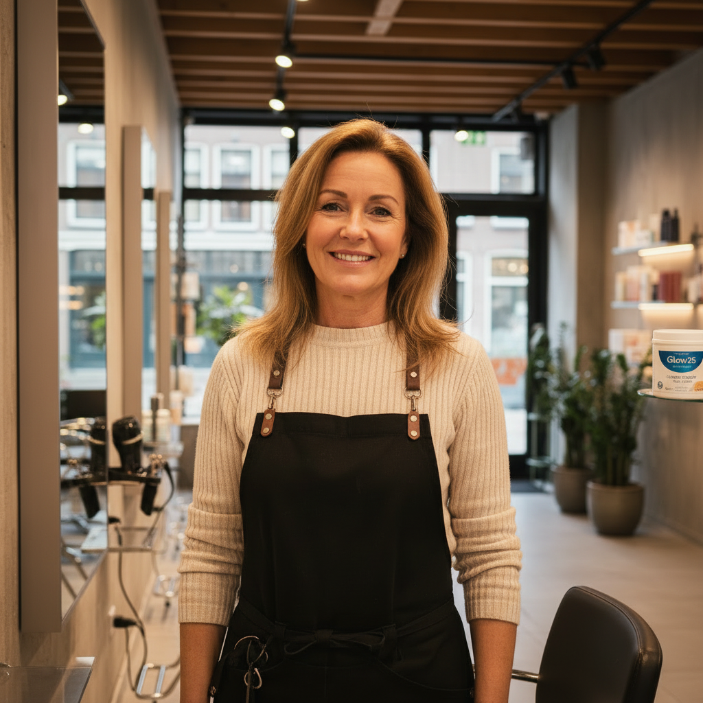 “Klanten merkten op dat mijn haar er beter uitzag,” vertelt ze. “Ze vroegen wat ik deed. En toen ik over Glow25 vertelde, wilden ze het zelf proberen.”
