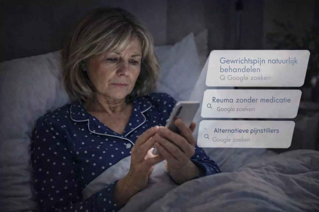 s Nachts, als de pijn haar wakker hield, zat ze in bed met haar mobiele telefoon en Google: “Gewrichtspijn op natuurlijke wijze behandelen”. “Reuma zonder medicijnen”. “Alternatief voor pijnstillers”.
